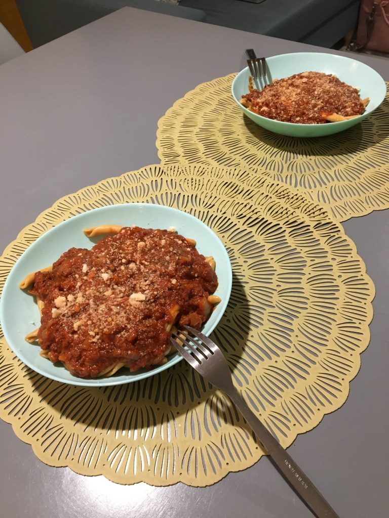 A wieczorem urządziliśmy sobie w naszym apartamencie prawdziwą włoską ucztę! Przywieziony z Toskanii makaron oraz „ragu di chianina”, czyli sos sporządzony z wołowiny rasy chianina, pomidorów na bazie oliwy z oliwek i wina, posłużył nam do przygotowania pysznego dania. Także Italia, którą tak bardzo kochamy, tego wieczoru została przywołana nie tylko we wspomnieniach 🙂 Wyszło przepysznie!