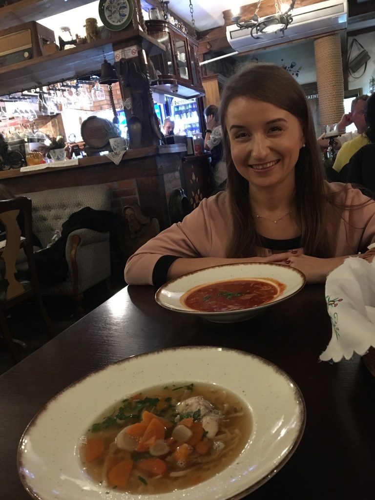 I to był bardzo dobry wybór. Restauracja okazała się świetnym, klimatycznym miejscem z muzyką graną na pianinie na żywo, pięknym wystrojem i wyśmienitą kuchnią. Poza tym kelnerki chodziły ubrane w lokalne stroje oraz były bardzo miłe. Sebastian jadł rosół, a na drugie żeberka z ziemniaczkami w mundurkach i ogórkami. Ja natomiast pomidorową oraz nogę kaczki z żurawiną, z ziemniaczkami w mundurkach i modrą kapustą. Wszystko było pięknie podane i porcje też były zadowalające.