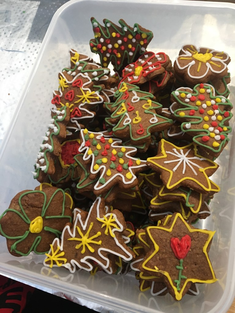 Na święta do rodziny nigdy nie przyjeżdżamy z pustymi rękami, zawsze coś przygotowujemy i przywozimy na stół. W tym roku zrobiliśmy uszka z kapustą i grzybami, pierniczki udekorowane lukrem, chleb i deser tiramisu. Zostaliśmy wyniesieni pod niebiosa przez rodzinę. Muszę przyznać, że za pierwszym razem, kiedy robiliśmy uszka, były to wieeelkie uuucha 🙂 Wyszły wtedy ogromne, niekształtne, natomiast oczywiście w smaku bardzo dobre. A teraz były po prostu idealne! Ciasteczka również podskoczyły poziom wyżej. Raz, że zrobiliśmy ich znacznie więcej, a dwa, że dekoracje też były o wiele bardziej dokładne oraz piękniejsze. Chleb jest już naszą specjalnością, o którą szczególnie moja rodzina się upomina, a tiramisu stało się odkryciem w tym roku. Na to wszystko na pewno złożyło się w dużym stopniu, że mieliśmy więcej czasu na przygotowania. Między innymi dzięki temu, że nie pracuję zawodowo i częścią rzeczy mogłam się zająć, kiedy Sebastian był w pracy. Oczywiście ile tylko mógł, mi pomagał. Muszę go też bardzo pochwalić. Bowiem mój wspaniały Mąż uratował mnie, kiedy na koniec ozdabiania ogromnej ilości pierniczków, napuchły mi palce od wyciskania lukru z tubek. I kiedy zastał mnie w salonie leżącą z wyciągniętymi i odpoczywającymi dłońmi, bez wahania sam powiedział, że dokończy malowanie ostatniej partii ciasteczek. Mimo tego, że akurat nie lubi tego zajęcia. Kochany! Takie gesty mnie bardzo rozczulają. Niestety nie zrobiliśmy zdjęć wszystkim naszym wyrobom. Mamy tylko zdjęcie części pierniczków.