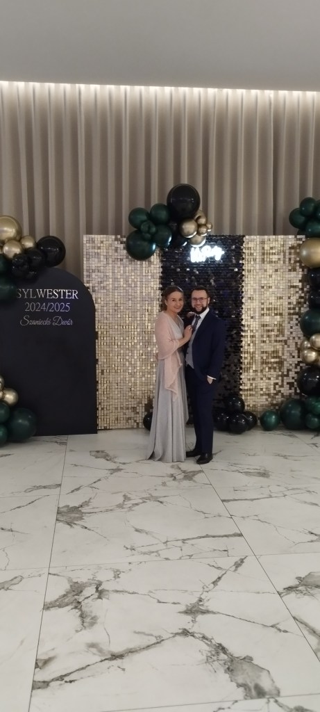 W tym roku postanowiliśmy spędzić Sylwestra na zorganizowanym balu w okolicach Buska Zdrój, gdzie mieliśmy zaplanowany nasz poświąteczny urlop. Wybraliśmy Szaniecki Dwór w samym Busko Zdroju. Nie wiedzieliśmy, czego możemy się spodziewać, gdyż to był nasz pierwszy taki bal na powitanie Nowego Roku. Zazwyczaj spędzaliśmy ten wieczór sami w domu, lub będąc na wyjeździe, w hotelu lub z bliskimi na domówce. Natomiast w tym roku doskwierało mi poczucie niewybawienia, ponieważ często musieliśmy wychodzić wcześniej z wielu imprez i wesel na których byliśmy z uwagi na złe samopoczucie, chorobę lub zaplanowane sprawy następnego dnia. W związku z tym podsunęłam myśl o wybranie się na bal sylwestrowy, a Sebastian przyjął ochoczo moją propozycję. Cóż, nie jest tajemnicą, że uwielbiamy się razem bawić, a i dobrze zjeść! I muszę powiedzieć, że była to bardzo dobra decyzja! Wybawiliśmy się za wszystkie czasy. Jesteśmy przede wszystkim zachwyceni salą, która była ogromna oraz miała bardzo wygodne ułożenie. Stoły były po dwóch stronach, a w środku był bardzo duży parkiet. Krzesełka przy stołach ustawione były w odpowiedniej odległości, że w żaden sposób nie stykaliśmy się z osobami siedzącymi obok łokciami, jak to czasem bywa na tego typu imprezach. Jednym słowem, siedziało się bardzo wygodnie oraz każdy miał bardzo dobry dostęp do wszystkiego, co było na stole. Jedzenie składające się z 4 gorących posiłków było przepyszne. Oczywiście porcje były tak duże, że nie dało się wszystkiego przejeść. Natomiast my już mamy opracowany swój system na weselach, że bierzemy jedną porcję i jemy wspólnie, żeby móc wszystkiego spróbować. W innym wypadku na pewno nie dalibyśmy rady. Ja jestem oczarowana słodkim stołem, który przewyższył wszelakie moje oczekiwania. A na słodkim to ja się znam! Pracowania cukiernicza „Konkretnie nadziane”, która przygotowała słodkości sprawiła, że moje podniebienie poczuło się jak w raju. Ptysie oraz pralinkowe desery z przeróżnymi kremami to totalny sztos pod względem smaku, jakości oraz świeżości, a też kunsztownego wyglądu. Od razu po imprezie napisałam do nich z podziękowaniem i pochwałą ich wyrobów, z czego bardzo się ucieszyli. Sebastian z racji swojego zamiłowania do muzyki, natomiast nie mógł wyjść z podziwu nad zespołem „Coma”, który prowadził imprezę w Szanieckim Dworze. Na uznanie zasługuje czysty i dźwięczny śpiew wokalistki, dynamiczna gra orkiestry oraz całościowy ich kontakt z bawiącymi. Od godziny 19 do 5 ludzie nie schodzili z parkietu, naprawdę mega szacunek za ich pracę. Cieszyliśmy się również, że zabawa odbyła się z pełną kulturą i nie było zataczających się oraz wszczynających awantury pijanych osób, mimo, że alkohol był obecny. Na szczęście wszystko było z umiarem. Pan taksówkarz, który odwoził nas z imprezy opowiadał, że w innych lokalach, z których odwoził ludzi z balów sylwestrowych było niemało nietrzeźwych i uciążliwych imprezowiczów. Dlatego tym bardziej się cieszymy, że u nas było pod tym względem w porządku. Nie zapomnę też miny taksówkarza, który przyjechał po nas pod wskazany adres naszej działki, na której byliśmy ustawieni kamperem na samym jej środku i zaczęliśmy się wyłaniać z pośród zarośniętej trawy. Ja z podciągniętą długą sukienką, a Sebastian kroczący jak bocian. Musieliśmy wyglądać niczym ludzie wyłaniający się z buszu 🙂
