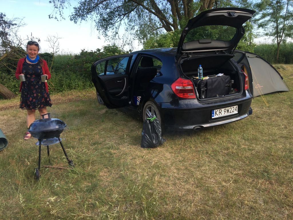 I właśnie na tym wyjeździe poznałam życie „kamperowe”. Jednym z kierowców, który nas zabrał ze sobą, był Rysiek. Było to dnia, kiedy ostatni samochód zostawił nas już na miejscu naszego noclegu nad jeziorem w okolicach Jeleniej Góry. Na miejscu stał jeden kamper. Postanowiłyśmy, że najpierw się wykąpiemy, a potem rozbijemy namiot. Mężczyzna z kampera słysząc naszą rozmowę zaproponował, że możemy przebrać się w jego kamperze, żeby nam było bardziej komfortowo. Po chwili rozmowy z nim, kiedy wyczułyśmy, że Rysiek nie ma złych intencji, skorzystałyśmy z jego propozycji. Wieczorem pomógł nam rozbić namiot, zaprosił nas na kolację i opowiadał o swoim życiu w kamperze. I tu w moim sercu rozpaliła się wielka chęć podróżowania w ten sposób. Idea przemierzania drogi z pełni wyposażonym domem na kółkach, spania każdego dnia gdzie indziej, z dala od cywilizacji, na dziko z pięknymi widokami, jawiła się dla mnie jak coś, do czego zostałam stworzona. Niestety dowiadując się o cenie tego pojazdu, moje emocje zostały szybko ostudzone. Biorąc pod uwagę to, że mój Mąż, a ówczesny chłopak po usłyszeniu o moim marzeniu, nie powiedział, że od jutra zaczyna zbierać pieniądze na kampera dla mnie, z bólem serca odłożyłam cały czas tlące się we mnie pragnienie.